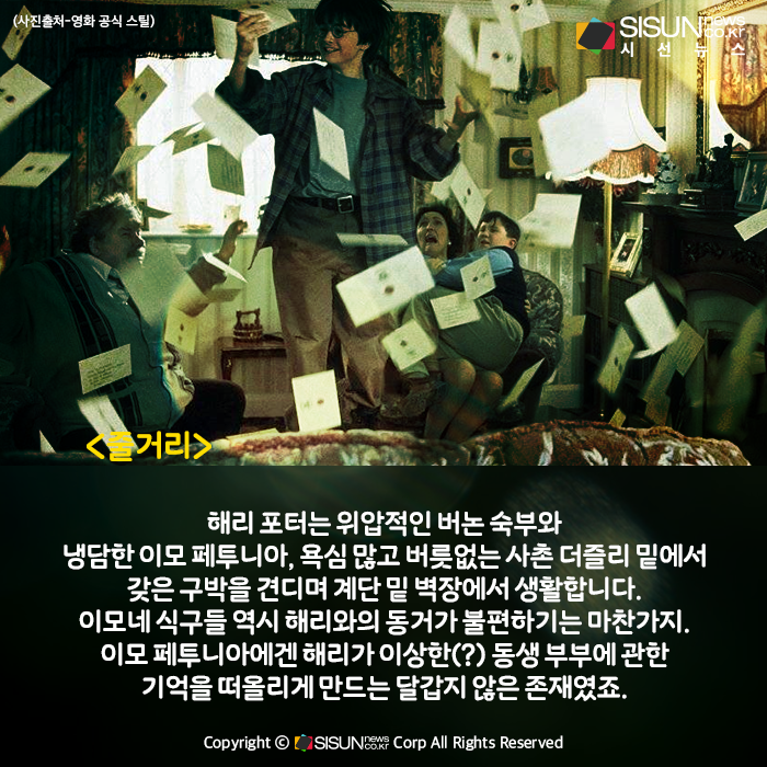 해리 포터(다니엘 래드클리프 분)는 위압적인 버논 숙부(리챠드 그리피스 분)와 냉담한 이모 페투니아 (피오나 쇼 분), 욕심 많고 버릇없는 사촌 더즐리(해리 멜링 분) 밑에서 갖은 구박을 견디며 계단 밑 벽장에서 생활합니다. 이모네 식구들 역시 해리와의 동거가 불편하기는 마찬가지. 이모 페투니아에겐 해리가 이상한(?) 동생 부부에 관한 기억을 떠올리게 만드는 달갑지 않은 존재였죠.