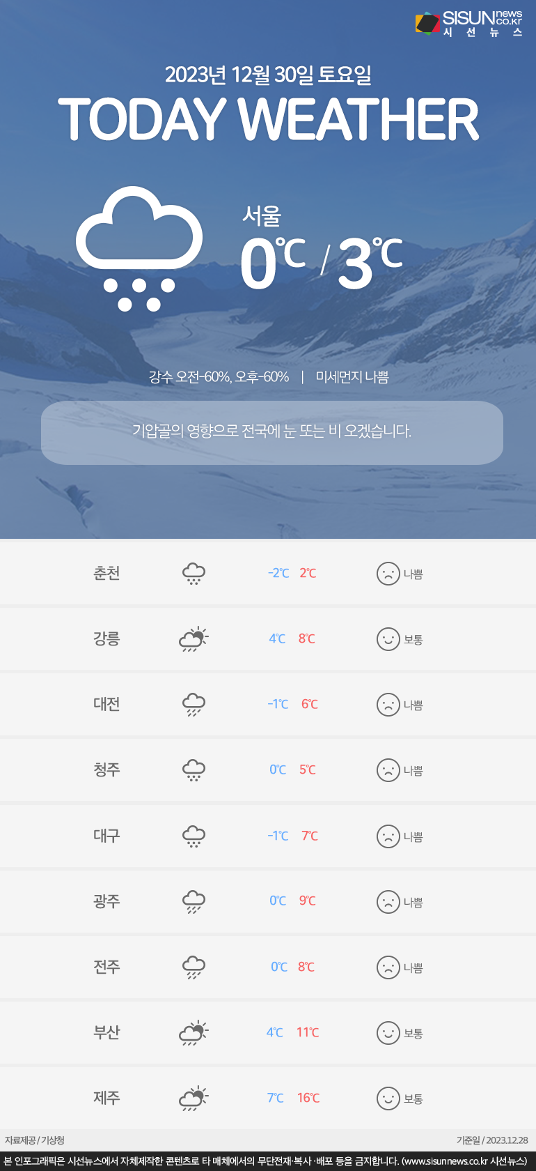 시선뉴스ㅣ오늘(30)은 기압골의 영향으로 전국에 눈 또는 비 오겠습니다. 아침최저기온은 -2도에서 7도, 낮 최고기온은 2도에서 16도가 되겠습니다.