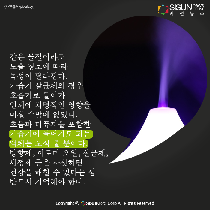 혹시라도 아직 세정제를 물에 섞어 공기 중에 분사되도록 나온 제품이 있다면 사용하지 말아야 한다. 가습기 살균제는 사람들의 폐에 섬유화 증세를 일으켰고, 2021년 1월 기준 신고된 사망자만 1,700여 명이 넘는다. 같은 물질이라도 노출 경로에 따라 독성이 달라진다. 가습기 살균제의 경우 호흡기로 들어가 인체에 치명적인 영향을 미칠 수밖에 없었다. 초음파 디퓨저를 포함한 가습기에 들어가도 되는 액체는 오직 물 뿐이다. 방향제, 아로마 오일, 살균제, 세정제 등은 자칫하면 건강을 해칠 수 있다는 점 반드시 기억해야 한다.