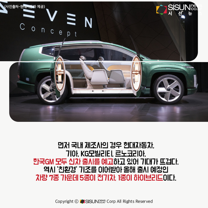 먼저 국내 제조사의 경우 현대자동차, 기아, KG모빌리티, 르노코리아, 한국GM 모두 신차 출시를 예고하고 있어 기대가 뜨겁다. 역시 ‘친환경’ 기조를 이어받아 올해 출시 예정인 차량 7종 가운데 5종이 전기차, 1종이 하이브리드이다.