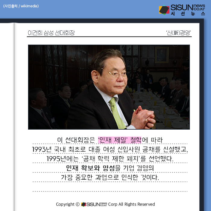 이건희 삼성 선대회장은 지난 1993년 6월 임원과 해외주재원 등 200여명을 프랑크푸르트 캠핀스키 호텔로 소집해 “국제화 시대에 변하지 않으면 영원히 이류가 된다.”며 “죽느냐 사느냐의 갈림길에 서 있다”라고 말했다. 그러면서 삼성 ‘신(新)경영’을 주문하고 전 부문에 있어 혁신을 요구했다. 그 유명한 “마누라와 자식 빼고 다 바꾸라”라는 말도 여기서 나왔다. 이 선대회장은 ‘인재 제일’ 철학에 따라 1993년 국내 최초로 대졸 여성 신입사원 공채를 신설했고, 1995년에는 ‘공채 학력 제한 폐지’를 선언했다. 인재 확보와 양성을 기업 경영의 가장 중요한 과업으로 인식한 것이다.