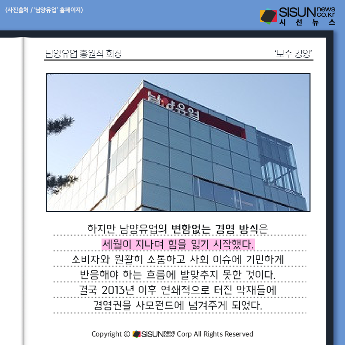 1990년 4월 아버지로부터 경영권을 물려받은 홍 회장은 보수적인 경영을 답습했다. 그의 경영 방식은 2017년 서울 논현동에 본사 사옥을 마련한 것 외에는 홍 창업회장과 판박이였다. 하지만 남양유업의 변함없는 경영 방식은 세월이 지나며 힘을 잃기 시작했다. 소비자와 원활히 소통하고 사회 이슈에 기민하게 반응해야 하는 흐름에 발맞추지 못한 것이다. 결국 2013년 이후 연쇄적으로 터진 악재들에 경영권을 사모펀드에 넘겨주게 되었다.