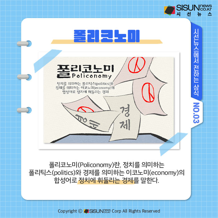 폴리코노미(Policonomy)란, 정치를 의미하는 폴리틱스(politics)와 경제를 의미하는 이코노미(economy)의 합성어로 정치에 휘둘리는 경제를 말한다. 선거 시즌이 되면 유권자의 지지를 얻기 위한 많은 공약들이 쏟아진다. 그 중 대부분의 공약은 ‘돈’이 필요한 공약들인데, 선심성 ‘돈’ 쓰는 공약이 과도하게 많아지면, 그 여파로 인플레이션 위험이 높아지고, 국가 부채가 늘게 된다.