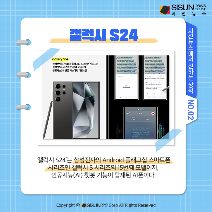 ‘갤럭시 S24’는 삼성전자의 Android 플래그십 스마트폰 시리즈인 갤럭시 S 시리즈의 15번째 모델이자, 인공지능(AI) 챗봇 기능이 탑재된 AI폰이다. 실시간 통화 번역 기능, 텍스트 내용 요약 기능, 사진 편집 AI 기능, 메시지 말투 변환 기능 등 삼성 가우스(Samsung Gauss)와 구글의 Gemini가 적용된 새로운 AI 기능이 다양하게 탑재되었다.