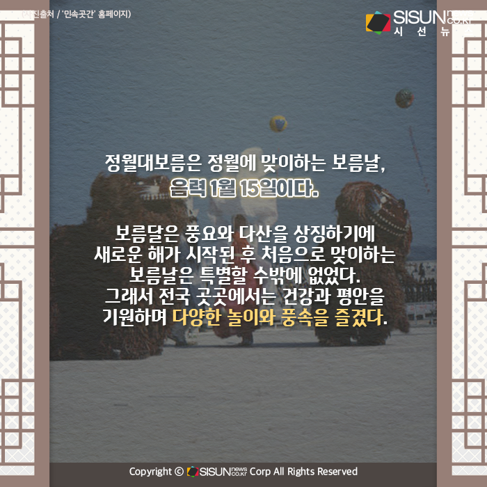 시선뉴스=박진아 기자 / 디자인=김선희 proㅣ우리나라의 대표적 세시명절의 하나로, 휴일이 아니지만 오늘날까지 이어지며 전통적인 풍습을 지키고 있는 날. 음력 새해의 첫 보름날을 뜻하며, 전통적인 농경사회였던 우리나라에서 마을 공동체를 기반으로 한해 농사의 풍요와 안정을 기원하는 날이기도 하다.