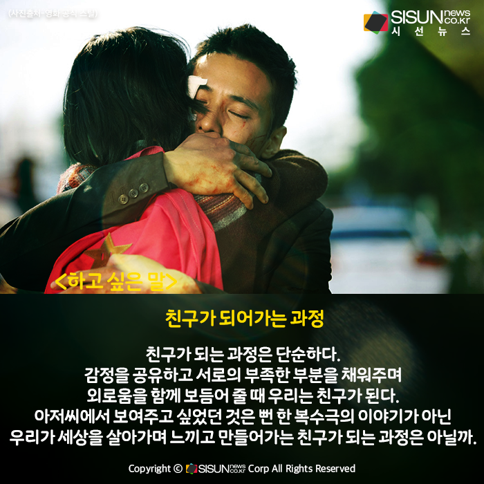 친구가 되는 과정은 단순하다. 감정을 공유하고 서로의 부족한 부분을 채워주며 외로움을 함께 보듬어 줄 때 우리는 친구가 된다. 그리고 우정과 사랑을 느낀다. 아저씨에서 보여주고 싶었던 것은 뻔 한 복수극의 이야기가 아닌 우리가 세상을 살아가며 느끼고 만들어가는 친구가 되는 과정은 아닐까.