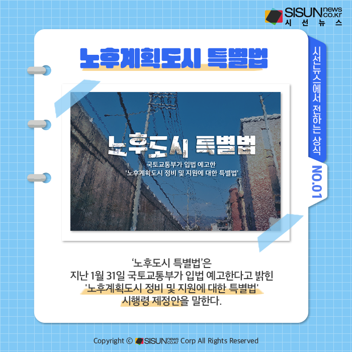 ‘노후도시 특별법’은 지난 1월 31일 국토교통부가 입법 예고한다고 밝힌 '노후계획도시 정비 및 지원에 대한 특별법' 시행령 제정안을 말한다. 이를 통해 전국 108개 지구, 215만가구가 노후계획도시 특별법의 적용 대상이 돼 재건축·재개발을 추진할 수 있게 된다.