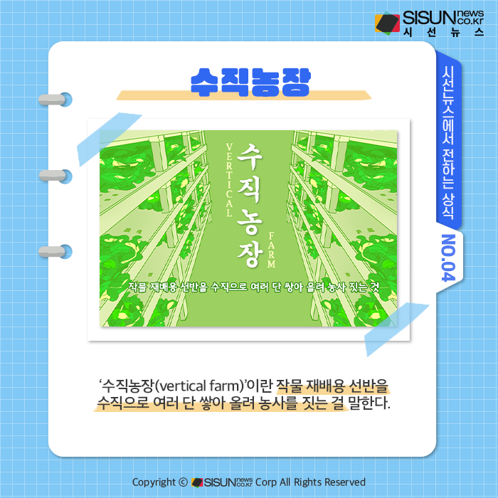 ‘수직농장(vertical farm)’이란 작물 재배용 선반을 수직으로 여러 단 쌓아 올려 농사를 짓는 걸 말한다. 이는 인공적으로 환경을 제어해 외부 환경과 기후 변화의 영향을 받지 않고 일정한 규격의 농산물을 연중 생산하는 차세대 시스템이다.