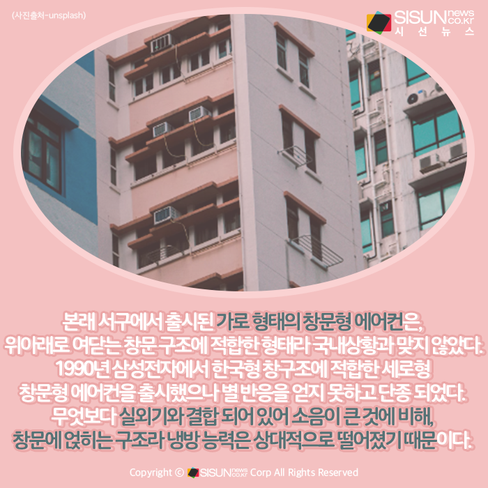 본래 서구에서 출시된 가로 형태의 창문형 에어컨은, 위아래로 여닫는 창문 구조에 적합한 형태라 국내에서는 수요가 거의 없었다. 그렇게 소형 창문형 에어컨은 거의 수요가 없다가, 1990년 삼성전자에서 한국형 창구조에 적합한 세로형 창문형 에어컨을 출시했으나, 별 반응을 얻지 못하고 단종되었다. 무엇보다 실외기와 결합 되어 있어 소음이 큰 것에 비해, 창문에 얹히는 구조라 냉방 능력은 상대적으로 떨어졌기 때문이다.