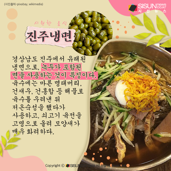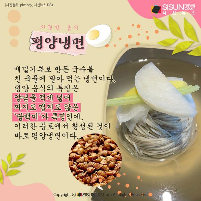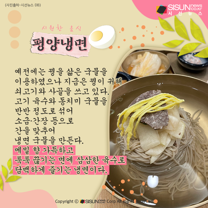 시선뉴스=양원민 기자 / 디자인=김선희 proㅣ시원한 음식으로 대표되는 ‘냉면’은 삶은 국수를 찬 육수에 넣어 양념과 고명을 얹은 우리나라 전통의 국수 요리다. 요새는 비교적 심심한 ‘평양냉면’이 인기가 많은데, 흔히들 아는 평양냉면과 함흥냉면 외에 어떤 냉면들이 있을까?