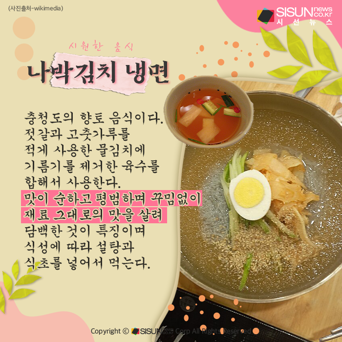 충청도의 향토 음식이다. 젓갈과 고춧가루를 적게 사용한 물김치에 기름기를 제거한 육수를 합해서 사용한다. 맛이 순하고 평범하며 꾸밈없이 재료 그대로의 맛을 살려 담백한 것이 특징이며 식성에 따라 설탕과 식초를 넣어서 먹는다.