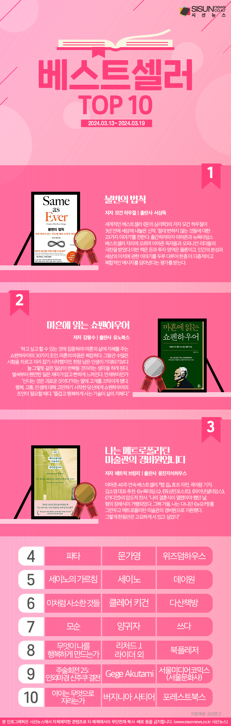 시선뉴스=김선희 proㅣ이번 주에는 어떤 책들이 독자들의 사랑을 받았을까요? 교보문고에서 2024년 03월 13일부터 03월 19일까지 영업점과 인터넷에서 도서와 eBook을 합산해 1주일 간 가장 많이 판매된 책 순위를 발표했습니다.