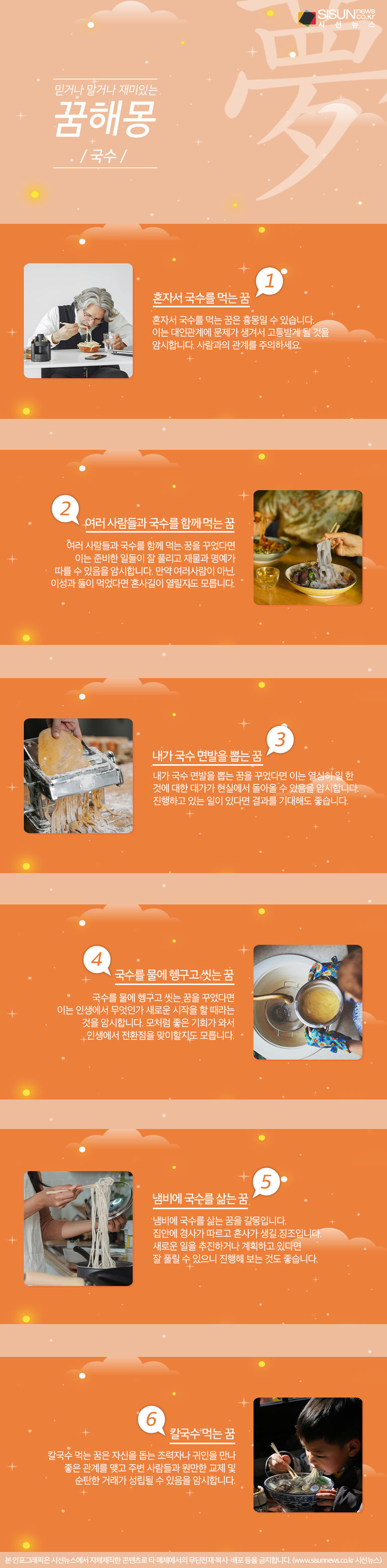 시선뉴스=박진아 기자 / 디자인=김선희 proㅣ예부터 꿈 해몽은 자신의 주변인의 미래를 예견하는데 중요한 역할을 해왔다. 물론 꿈 해몽이 정확하게 다 맞는 것은 아니지만 하루를 맞이하는 마음가짐에 적절한 참고를 해도 좋을 것이다. 오늘은 ‘국수’에 관련된 꿈 해몽을 소개한다.