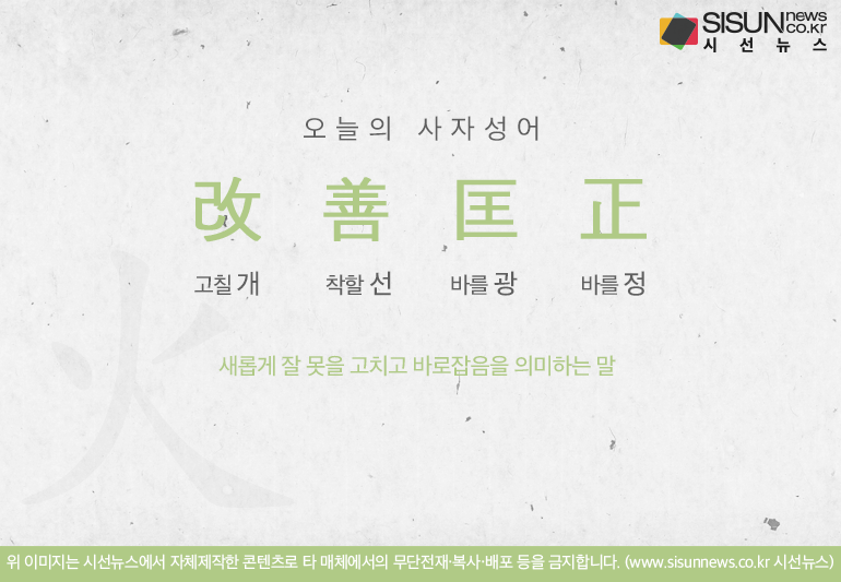 [고칠 개, 착할 선, 바를 광, 바를 정]의 글자로 만들어진 사자성어 개선광정은 새롭게 잘못을 고치고 바로잡음을 의미하는 말입니다.