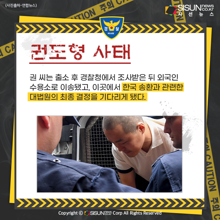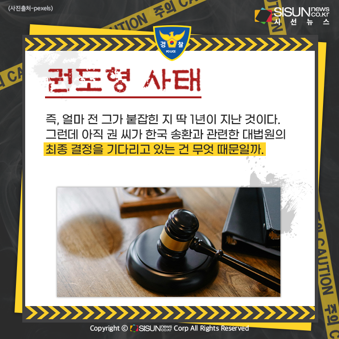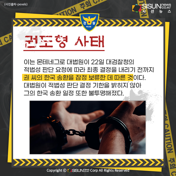 즉, 얼마 전 그가 붙잡힌 지 딱 1년이 지났다. 현재 권 씨가 한국 송환과 관련한 대법원의 최종 결정을 기다리게 된 건 앞서 몬테네그로 대법원이 22일 대검찰청의 적법성 판단 요청에 따라 최종 결정을 내리기 전까지 권 씨의 한국 송환을 잠정 보류한 데 따른 것이다. 대법원이 적법성 판단 결정 기한을 밝히지 않아 그의 한국 송환 일정 또한 불투명해졌다.