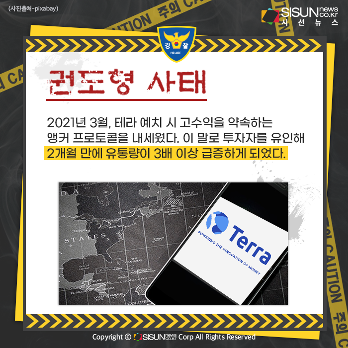 그리고 2021년 3월, 테라 예치 시 고수익을 약속하는 앵커 프로토콜을 내세웠다. 이 말로 투자자를 유인해 2개월 만에 유통량이 3배 이상 급증하게 되었다. 그런데 같은 해 5월, 테라 가치가 1달러 밑으로 급락했다. 이때 권 씨는 미국의 한 회사와 함께 공모 후 테라를 대량 구입했고, 이를 통해 1달러 수준으로 회복할 수 있었다.