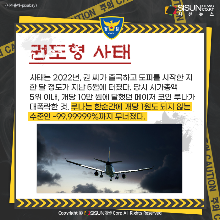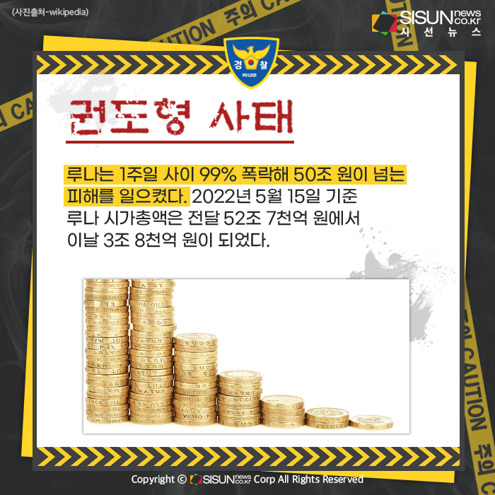 사태는 2022년, 권 씨가 출국하고 도피를 시작한 지 한 달 정도가 지난 5월에 터졌다. 당시 시가총액 5위 이내, 개당 10만 원에 달했던 메이저 코인 루나가 대폭락했다. 루나는 한순간에 개당 1원도 되지 않는 수준인 -99.99999%까지 무너졌다. 이 정도로 크게 붕괴된 사례는 이번이 처음이었다.