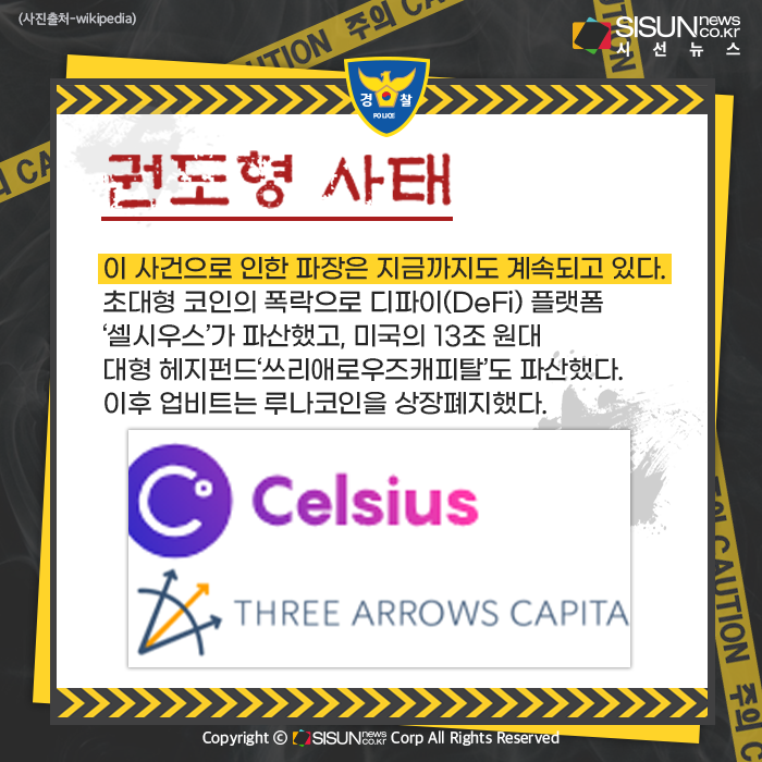 이 사건으로 인한 파장은 지금까지도 계속되고 있다. 초대형 코인의 폭락으로 디파이(DeFi) 플랫폼 ‘셀시우스’가 파산했고, 미국의 13조 원대 대형 헤지펀드 ‘쓰리애로우즈캐피탈’도 파산했다. 이후 업비트는 루나코인을 상장폐지했다.