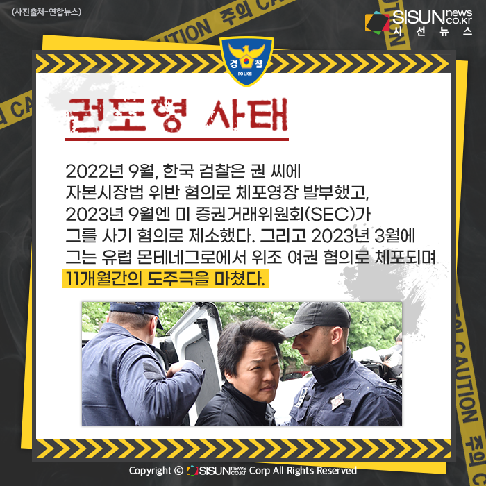 2022년 9월, 한국 검찰은 권 씨에 자본시장법 위반 혐의로 체포영장 발부했고, 2023년 9월엔 미 증권거래위원회(SEC)가 그를 사기 혐의로 제소했다. 그리고 2023년 3월에 그는 유럽 몬테네그로에서 위조 여권 혐의로 체포되며 11개월간의 도주극을 마쳤다.