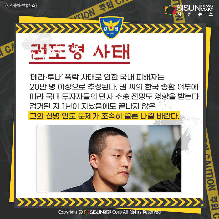 ‘테라·루나’ 폭락 사태로 인한 국내 피해자는 20만 명 이상으로 추정된다. 권 씨의 한국 송환 여부에 따라 국내 투자자들의 민사 소송 전망도 영향을 받는다. 검거된 지 1년이 지났음에도 끝나지 않은 그의 신병 인도 문제가 조속히 결론 나길 바란다.