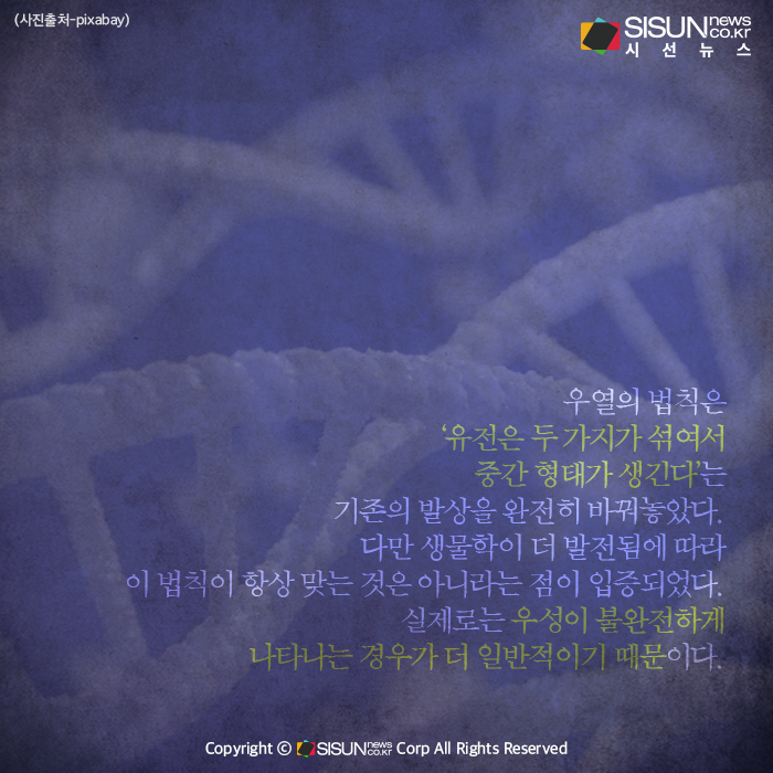 우열의 법칙은 ‘유전은 두 가지가 섞여서 중간 형태가 생긴다’는 기존의 발상을 완전히 바꿔놓았다. 다만 생물학이 더 발전됨에 따라 이 법칙이 항상 맞는 것은 아니라는 점이 입증되었다. 실제로는 우성이 불완전하게 나타나는 경우가 더 일반적이기 때문이다. 한쪽 유전자가 대립 유전자를 완전히 압도하는 사례는 생각보다 적었다.