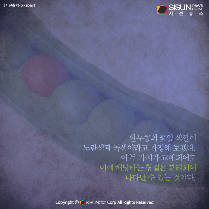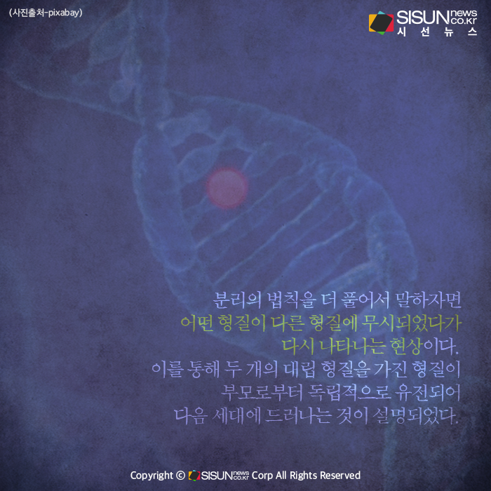 분리의 법칙을 더 풀어서 말하자면 어떤 형질이 다른 형질에 무시되었다가 다시 나타나는 현상이다. 이를 통해 두 개의 대립 형질을 가진 형질이 부모로부터 독립적으로 유전되어 다음 세대에 드러나는 것이 설명되었다. 완두콩의 꽃잎 색깔이 노란색과 녹색이라고 가정해 보겠다. 이 두 가지가 교배되어도 이에 해당하는 형질은 분리되어 나타날 수 있는 것이다.
