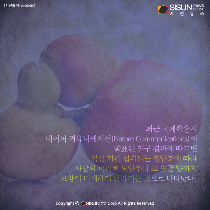 최근 국제학술지 네이처 커뮤니케이션(Nature Communications)에 발표된 연구 결과에 따르면 임신 기간 섭취되는 영양분에 따라 사람의 머리뼈 모양부터 코 연골 양까지 모양이 미세하게 달라지는 것으로 나타났다. 이로 인해 형제더라도 생김새가 조금씩 다른 것이라고 한다.