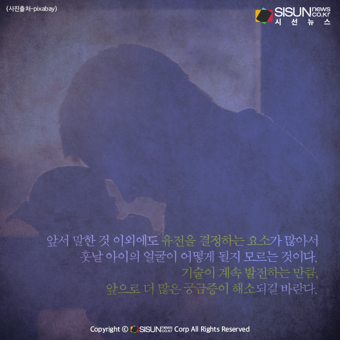 아직도 밝혀지지 않은 부분이 많은 ‘유전’. 다양한 사실이 발견되었지만, 뱃속의 태아의 생김새와 성격이 어떻게 형성될지 명확히 예측할 수는 없다. 앞서 말한 것 이외에도 유전을 결정하는 요소가 많기 때문이다. 기술이 계속 발전하는 만큼, 앞으로 더 많은 궁금증이 해소되길 바란다.