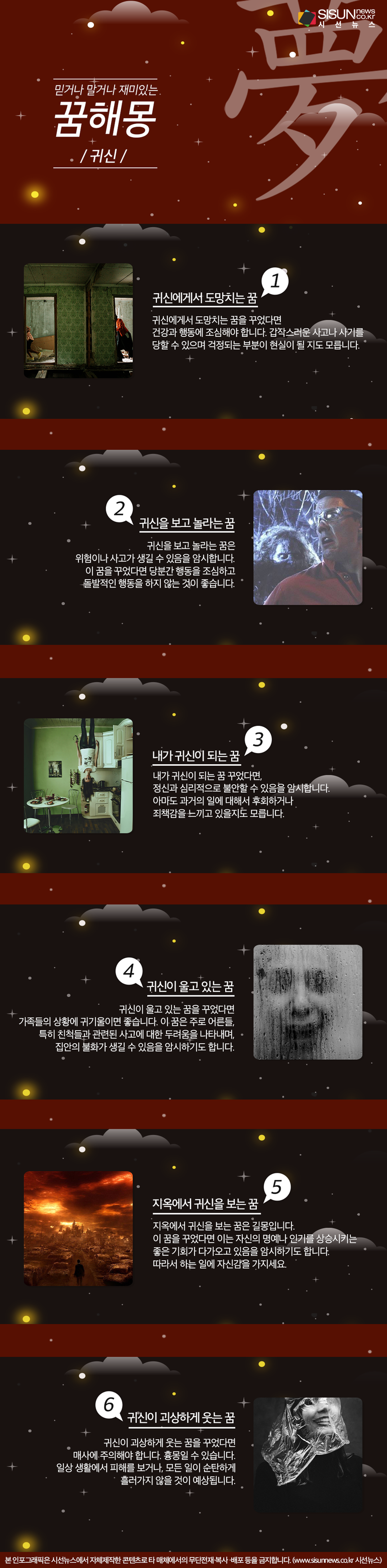 시선뉴스=박진아 기자 / 디자인=김선희 proㅣ예부터 꿈 해몽은 자신의 주변인의 미래를 예견하는데 중요한 역할을 해왔다. 물론 꿈 해몽이 정확하게 다 맞는 것은 아니지만 하루를 맞이하는 마음가짐에 적절한 참고를 해도 좋을 것이다. 오늘은 ‘귀신’에 관련된 꿈 해몽을 소개한다.