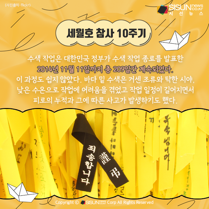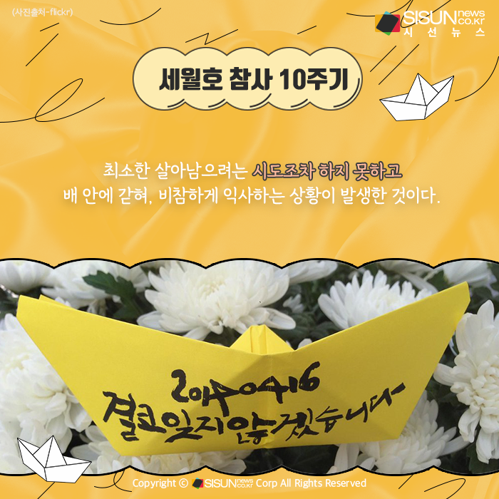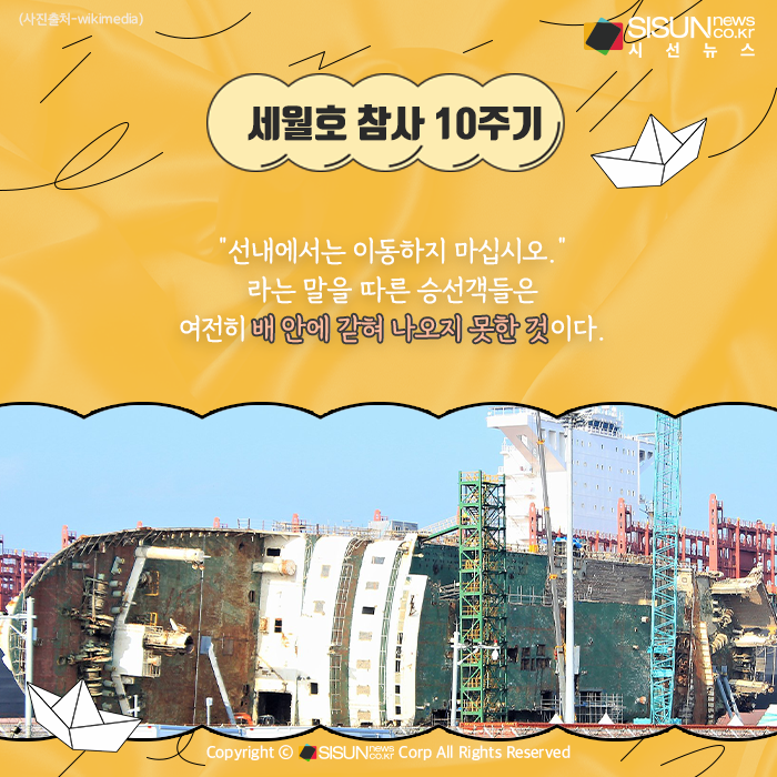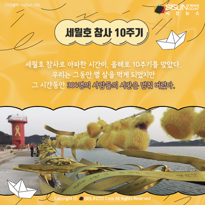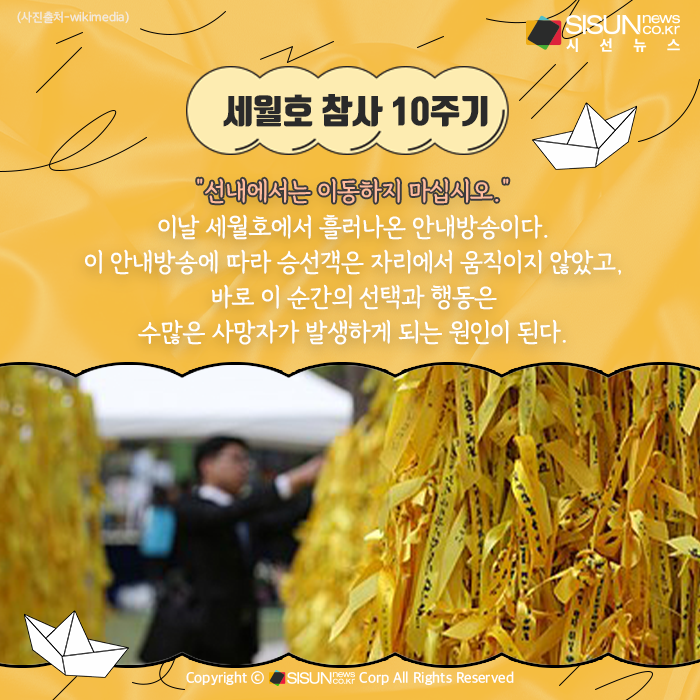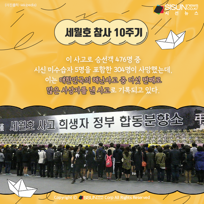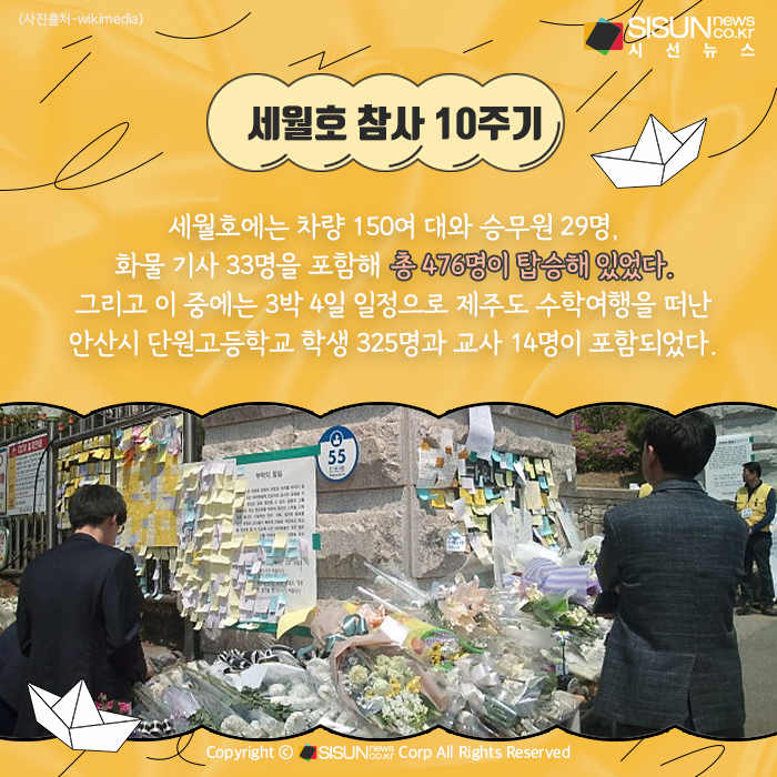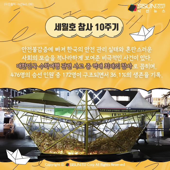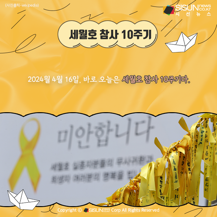 시선뉴스=박진아 기자 / 디자인=김선희 proㅣ안전불감증에 빠져 한국의 안전 관리 실태와 혼란스러운 사회의 모습을 적나라하게 보여준 비극적인 사건이 있다. 대한민국 수학여행 관련 사고 중 역대 최대의 참사로 꼽히며, 476명의 승선 인원 중 172명이 구조되면서 36.1%의 생존율 기록. 2024월 4월 16일, 바로 오늘은 세월호 참사 10주기다.