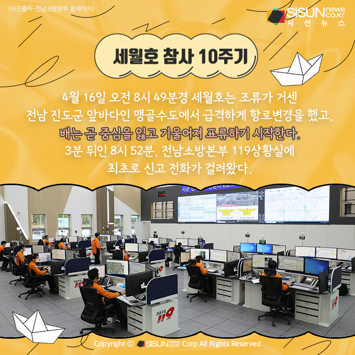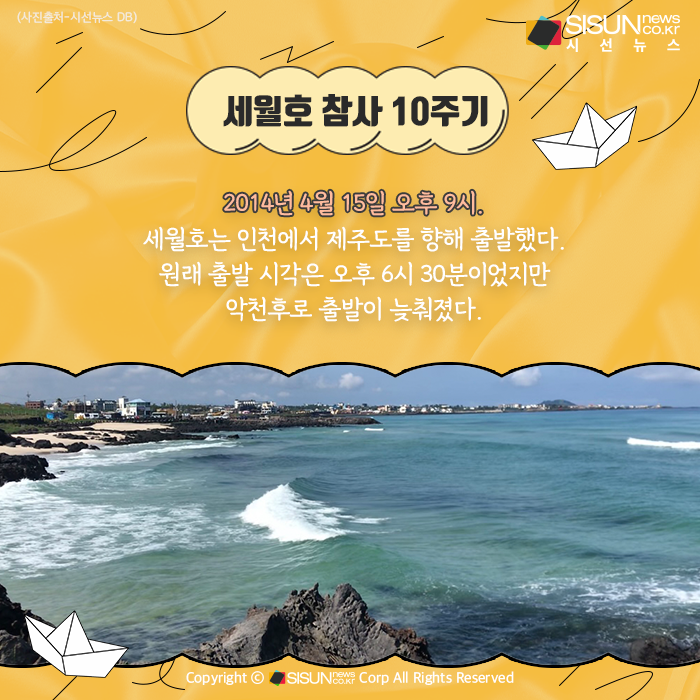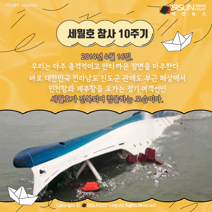 2014년 4월 16일. 우리는 아주 충격적이고 안타까운 장면을 마주한다. 바로 대한민국 전라남도 진도군 관매도 부근 해상에서 인천항과 제주항을 오가는 정기 여객선인 세월호가 전복되어 침몰하는 모습이다.