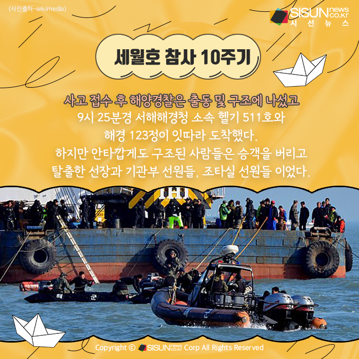 사고 접수 후 해양경찰은 출동 및 구조에 나섰고 9시 25분경 서해해경청 소속 헬기 511호와 해경 123정이 잇따라 도착했다. 하지만 안타깝게도 구조된 사람들은 승객을 버리고 탈출한 선장과 기관부 선원들, 조타실 선원들 이었다. “선내에서는 이동하지 마십시오.” 라는 말을 따른 승선객들은 여전히 배 안에 갇혀 나오지 못한 것이다.