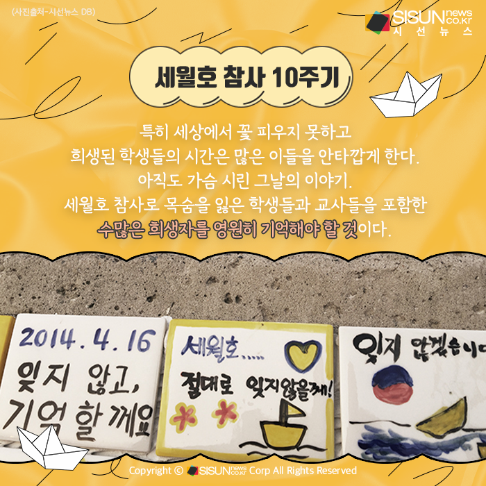 세월호 참사로 아파한 시간이, 올해로 10주기를 맞았다. 우리는 그동안 열 살을 먹게 되었지만 그 시간동안 304명의 사람들의 시간은 멈춰 버렸다. 특히 세상에서 꽃 피우지 못하고 희생된 학생들의 시간은 많은 이들을 안타깝게 하다. 아직도 가슴 시린 그날의 이야기. 세월호 참사로 목숨을 잃은 학생들과 교사들을 포함한 수많은 희생자를 영원히 기억해야 할 것이다.
