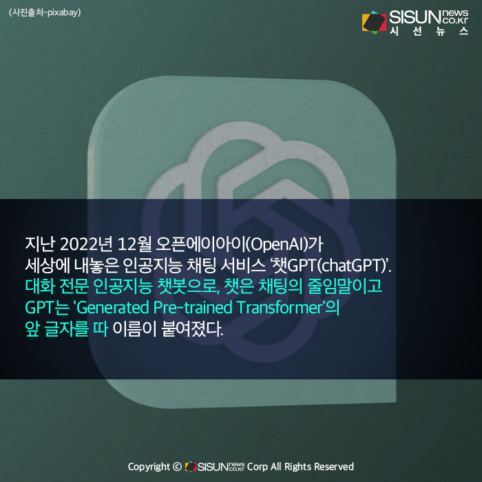 지난 2022년 12월 오픈에이아이(OpenAI)가 세상에 내놓은 인공지능 채팅 서비스 ‘챗GPT(chatGPT)’. 대화 전문 인공지능 챗봇으로, 챗은 채팅의 줄임말이고 GPT는 'Generated Pre-trained Transformer'의 앞 글자를 따 이름이 붙여졌다.