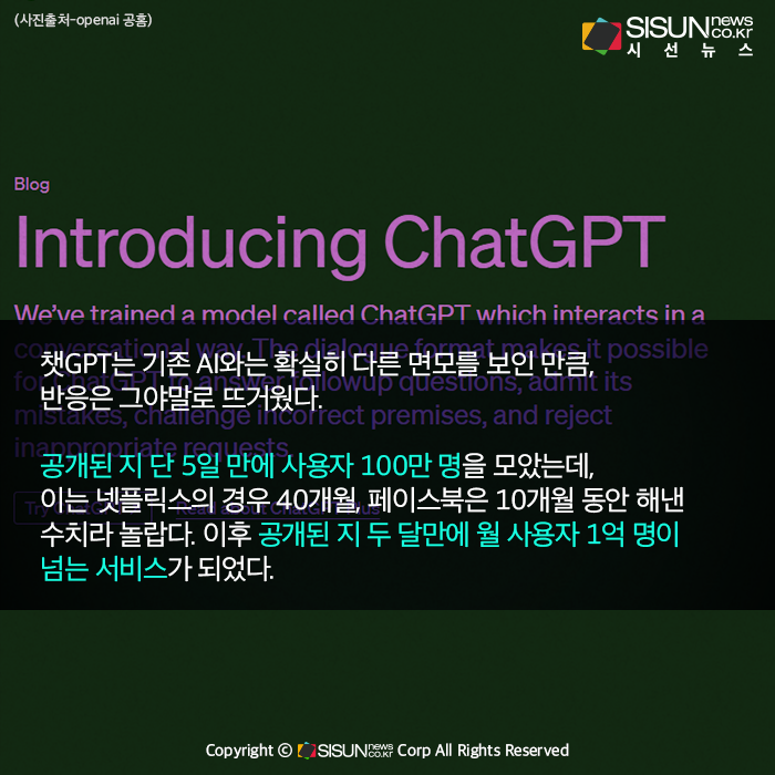 챗GPT는 기존 AI와는 확실히 다른 면모를 보인 만큼, 반응은 그야말로 뜨거웠다. 공개된 지 단 5일 만에 사용자 100만 명을 모았는데, 이는 넷플릭스의 경우 40개월, 페이스북은 10개월 동안 해낸 수치라 놀랍다. 이후 공개된 지 두 달만에 월 사용자 1억 명이 넘는 서비스가 되었다.