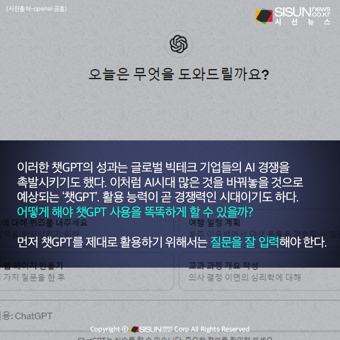 이러한 챗GPT의 성과는 글로벌 빅테크 기업들의 AI 경쟁을 촉발시키기도 했다. 이처럼 AI시대 많은 것을 바꿔놓을 것으로 예상되는 ‘챗GPT’. 이에 대한 활용 능력이 곧 경쟁력인 시대이기도 하다. 어떻게 해야 챗GPT 사용을 똑똑하게 할 수 있을까? 무엇보다 챗GPT를 제대로 활용하기 위해선 질문을 잘 입력하는 것이 중요하다.