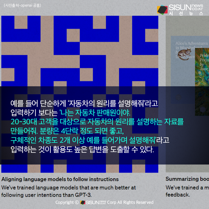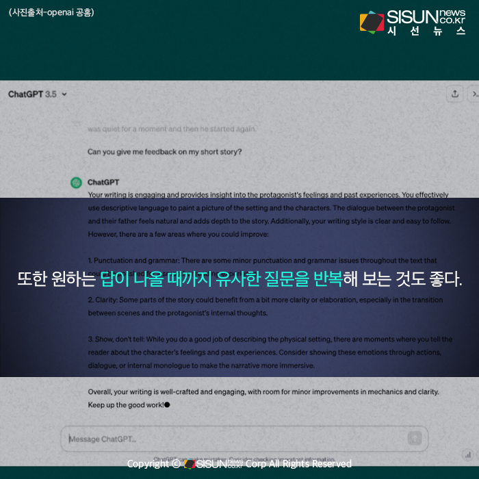 그리고 가능한 상황을 구체적으로 설명하듯 입력하는 것이 좋다. 챗GPT는 단순한 대화 챗봇이 아니라, 대화의 맥락을 기억하는 AI라는 것을 인지해야 한다. 따라서 챗GPT를 효과적으로 활용하기 위해선 구체적인 배경과 목적을 설명해야 한다. 예를 들어 단순하게 ‘자동차의 원리를 설명해줘’라고 입력하기 보다는 ‘나는 자동차 판매원이야. 20-30대 고객을 대상으로 자동차의 원리를 설명하는 자료를 만들어줘. 분량은 4단락 정도 되면 좋고, 구체적인 차종도 2개 이상 예를 들어가며 설명해줘’라고 입력하는 것이 활용도 높은 답변을 도출할 수 있다. 또한 원하는 답이 나올 때까지 유사한 질문을 반복해 보는 것도 좋다.