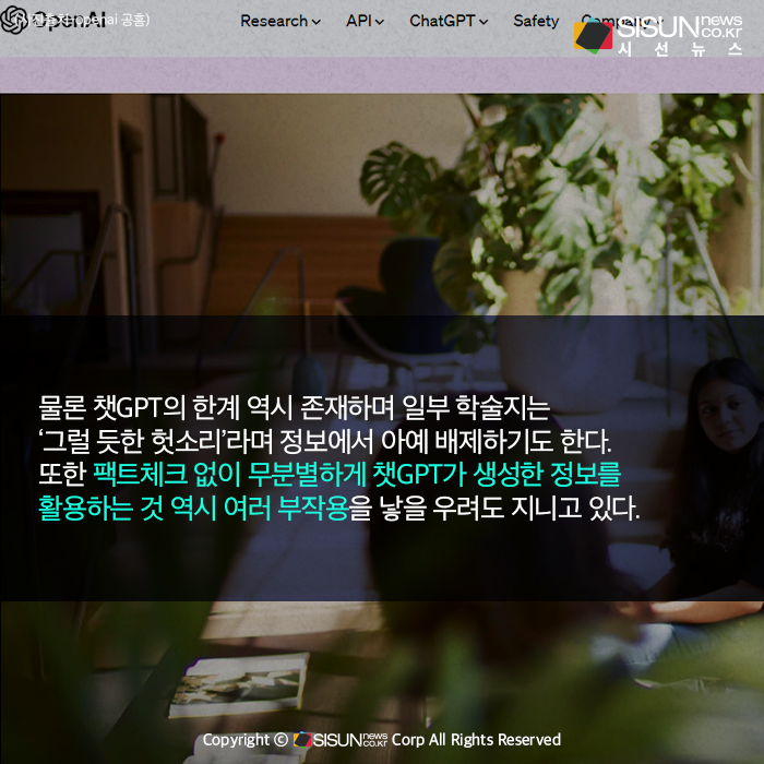 물론 챗GPT의 한계 역시 존재하며 일부 학술지는 ‘그럴 듯한 헛소리’라며 정보에서 아예 배제하기도 한다. 또한 팩트체크 없이 무분별하게 챗GPT가 생성한 정보를 활용하는 것 역시 여러 부작용을 낳을 우려도 지니고 있다. AI 시대의 핵심 기술인 인공지능과의 ‘대화’ 기능이 기술적으로는 물론 윤리적으로도 올바르게 발전해 인류의 삶에 긍정적인 변화를 만들어가길 기대한다.