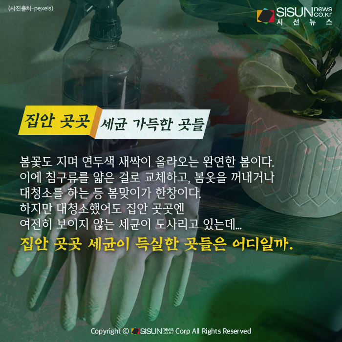 시선뉴스=양원민 기자 / 디자인=김선희 proㅣ봄꽃도 지며 연두색 새싹이 올라오는 완연한 봄이다. 이에 침구류를 얇은 걸로 교체하고, 봄옷을 꺼내거나 대청소를 하는 등 봄맞이가 한창이다. 하지만 대청소했어도 집안 곳곳엔 여전히 보이지 않는 세균이 도사리고 있는데, 주목할 만한 세균이 득실한 곳들은 어디일까.