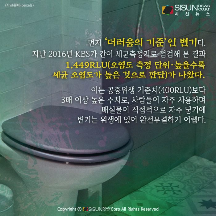 먼저, ‘더러움의 기준’인 변기다. 지난 2016년 KBS가 간이 세균측정기로 점검해 본 결과 1,449RLU(오염도 측정 단위·높을수록 세균 오염도가 높은 것으로 판단)가 나왔다. 이는 공중위생 기준치(400RLU)보다 3배 이상 높은 수치로, 사람들이 자주 사용하며 배설물이 직접적으로 자주 닿기에 변기는 위생에 있어 완전무결하기 어렵다.