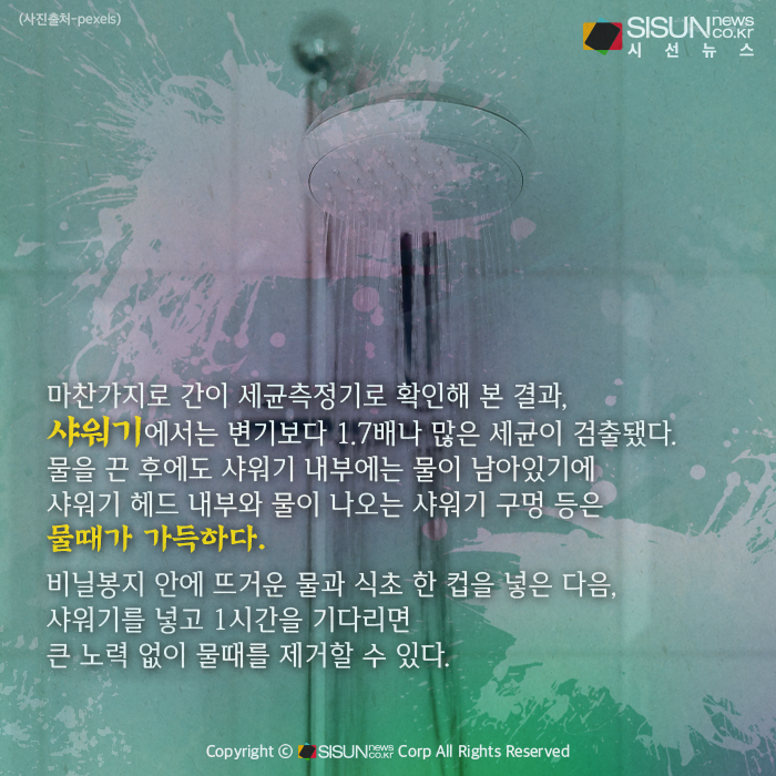 그러나 변기보다 심한 곳들이 많다. 마찬가지로 간이 세균측정기로 확인해 본 결과, 샤워기에서는 변기보다 1.7배나 많은 세균이 검출됐다. 늘 흐르는 물로 인해 더러울 거라 생각하지 못하지만, 물을 끈 후에도 샤워기 내부엔 물이 남아있기에 샤워기 헤드 내부와 물이 나오는 샤워기 구멍 등은 물때가 가득하다. 비닐봉지 안에 뜨거운 물과 식초 한 컵을 넣은 다음, 샤워기를 넣고 1시간을 기다리면 큰 노력 없이 물때를 제거할 수 있다.