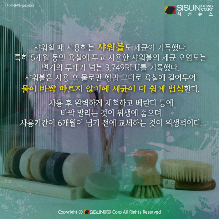 샤워할 때 사용하는 샤워볼도 세균이 가득했다. 특히 5개월 동안 욕실에 두고 사용한 샤워볼의 세균 오염도는 변기의 두배가 넘는 3,749RLU를 기록했다. 다만 첫 사용 때부터 세균이 많은 것은 아니다. 샤워볼은 사용 후 물로만 헹궈 그대로 욕실에 걸어두어 물이 바짝 마르지 않기에 세균이 더 쉽게 번식한다. 또 이물질이 낄 수 있는 틈새가 많은 여러 겹의 그물망 모양도 세균 번식에 유리하다. 사용 후 완벽하게 세척하고 베란다 등에 바짝 말리는 것이 위생에 좋으며 사용기간이 6개월이 넘기 전에 교체하는 것이 위생적이다.
