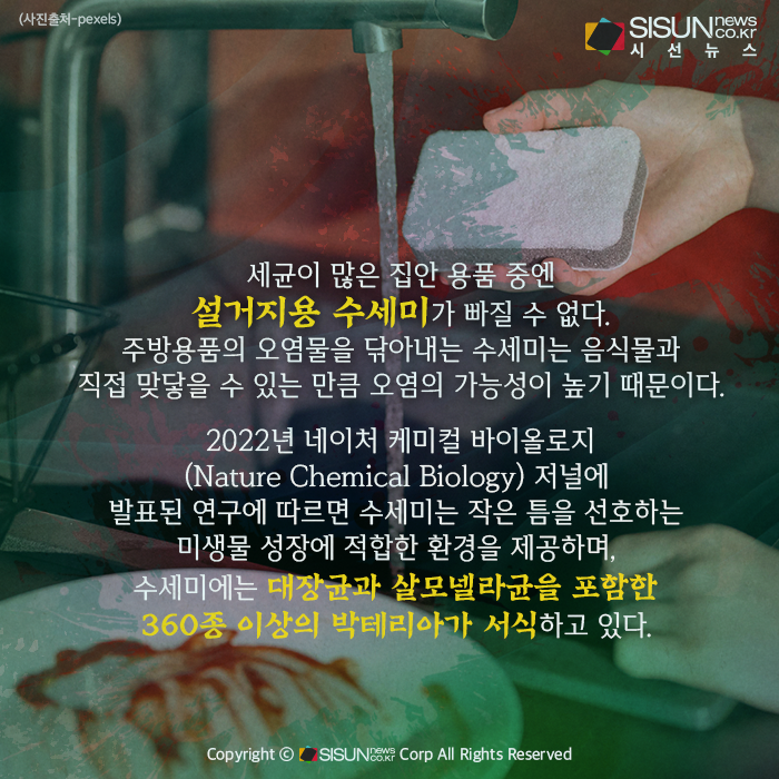 세균이 많은 집안 용품 중엔 설거지용 수세미가 빠질 수 없다. 주방용품의 오염물을 닦아내는 수세미는 음식물과 직접 맞닿을 수 있는 만큼 오염의 가능성이 높기 때문이다. 2022년 네이처 케미컬 바이올로지(Nature Chemical Biology) 저널에 발표된 연구에 따르면 수세미는 작은 틈을 선호하는 미생물 성장에 적합한 환경을 제공하며, 수세미에는 대장균과 살모넬라균을 포함한 360종 이상의 박테리아가 서식하고 있다. 샤워볼과 마찬가지로 바짝 말려서 보관하고 장기간 사용하지 않는 것이 좋겠다.