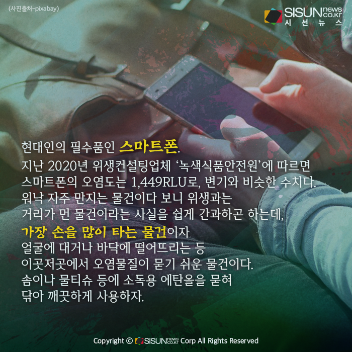 현대인의 필수품인 스마트폰. 지난 2020년 위생컨설팅업체 ‘녹색식품안전원’에 따르면 스마트폰의 오염도는 1,449RLU로, 변기와 비슷한 수치다. 워낙 자주 만지는 물건이다 보니 위생과는 거리가 먼 물건이라는 사실을 쉽게 간과하곤 하는데, 가장 손을 많이 타는 물건이자 얼굴에 대거나 바닥에 떨어뜨리는 등 이곳저곳에서 오염물질이 묻기 쉬운 물건이다. 솜이나 물티슈 등에 소독용 에탄올을 묻혀 닦아 깨끗하게 사용하자.