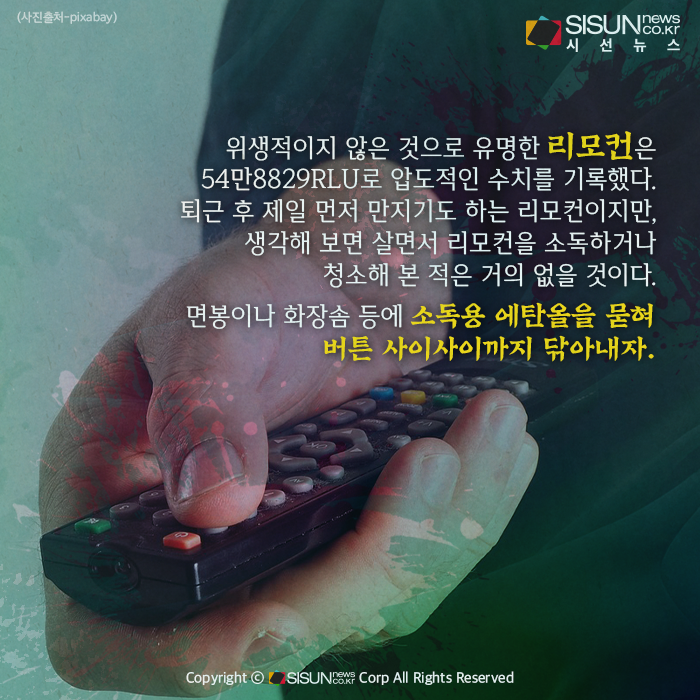 위생적이지 않은 것으로 유명한 리모컨은 54만8829RLU로 압도적인 수치를 기록했다. 업체는 “작은 틈새가 많은 물건일수록 세균이 많이 나오는 경향이 있다”고 말했다. 퇴근 후 제일 먼저 만지기도 하는 리모컨이지만, 생각해 보면 살면서 리모컨을 소독하거나 청소해 본 적은 거의 없을 것이다. 면봉이나 화장솜 등에 소독용 에탄올을 묻혀 버튼 사이사이까지 닦아내자.
