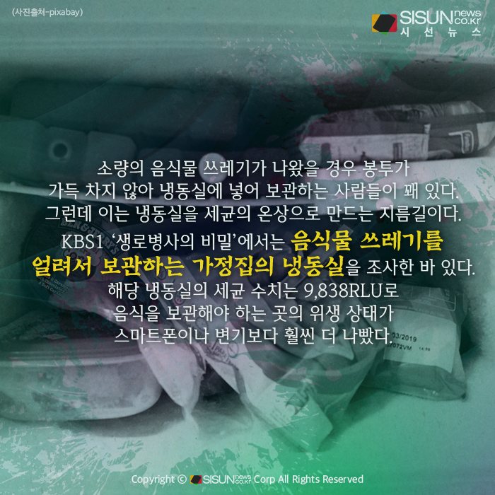 소량의 음식물 쓰레기가 나왔을 경우 봉투가 가득 차지 않아 냉동실에 넣어 보관하는 사람들이 꽤 있다. 그런데 이는 냉동실을 세균의 온상으로 만드는 지름길이다. KBS1 ‘생로병사의 비밀’에서는 음식물 쓰레기를 얼려서 보관하는 가정집의 냉동실을 조사한 바 있다. 해당 냉동실의 세균 수치는 9,838RLU로 음식을 보관해야 하는 곳의 위생 상태가 스마트폰이나 변기보다 훨씬 더 나빴다.