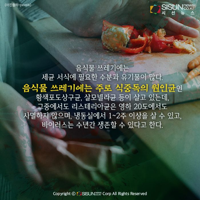 음식물 쓰레기에는 세균 서식에 필요한 수분과 유기물이 많다. 음식물 쓰레기에는 주로 식중독의 원인균인 황색포도상구균, 살모넬라균 등이 살고 있는데, 그중에서도 리스테리아균은 영하 20도에서도 사멸하지 않으며, 냉동실에서 1~2주 이상을 살 수 있고, 바이러스는 수년간 생존할 수 있다고 한다. 바로바로 버리거나 음식물 처리기 등을 사용하며 냉장고 안에 넣는 일은 없도록 하자.