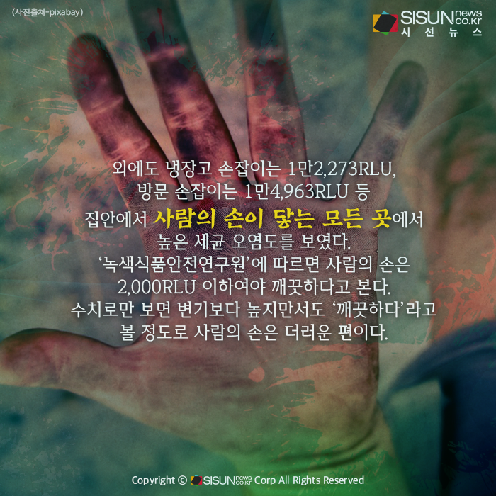 외에도 냉장고 손잡이는 1만2,273RLU, 방문 손잡이는 1만4,963RLU 등 집안에서 사람의 손이 닿는 모든 곳에서 높은 세균 오염도를 보였다. ‘녹색식품안전연구원’에 따르면 사람의 손은 2,000RLU 이하여야 깨끗하다고 본다. 수치로만 보면 변기보다 높지만서도 ‘깨끗하다’라고 볼 정도로 사람의 손은 더러운 편이다.