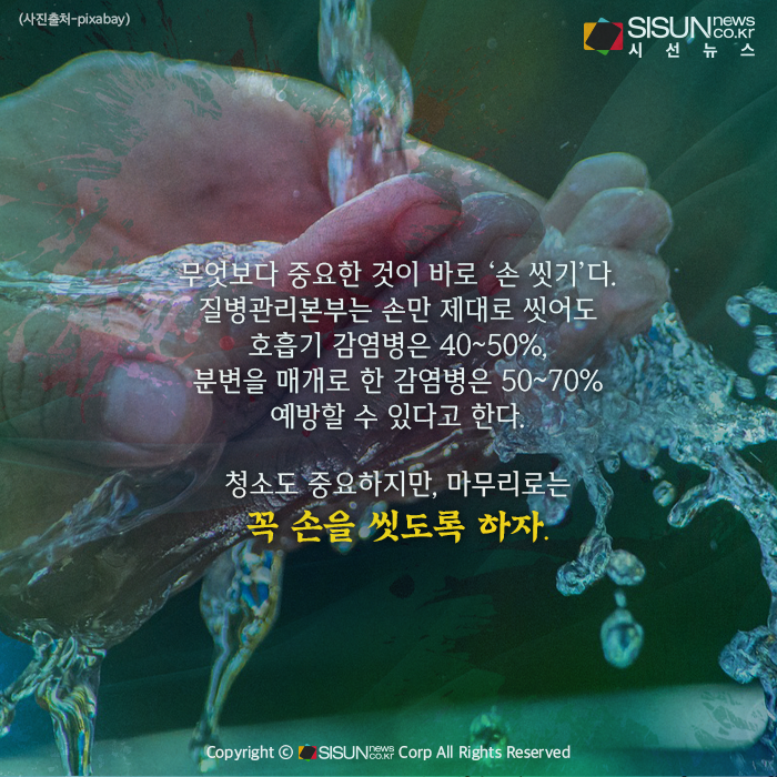 그렇기에 무엇보다 중요한 것이 바로 ‘손 씻기’다. 질병관리본부는 손만 제대로 씻어도 호흡기 감염병은 40~50%, 분변을 매개로 한 감염병은 50~70% 예방할 수 있다고 한다. 청소도 중요하지만, 마무리로는 꼭 손을 씻도록 하자.