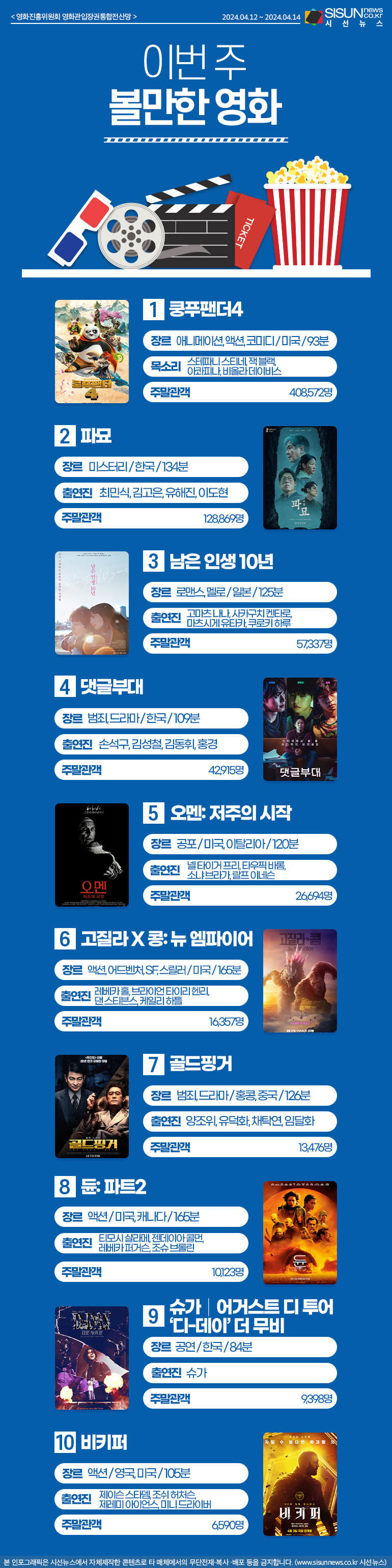 시선뉴스=김선희 proㅣ이번 주 볼만한 영화, 어떤 것들이 있을까요? 지난 2024년 04월 12일부터 2024년 04월 14까지 영화진흥위원회 영화관입장권통합전산망의 랭킹을 알려드립니다.